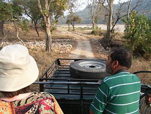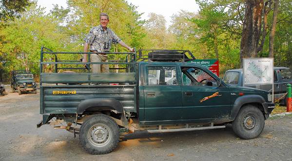 Da der Jeep des Hotels defekt war hatte Manoj von einem Nachbarn einen Jeep mit Fahrer gemietet, der uns durch den Park fuhr. Der Fahrtwind war auch früh am Morgen schon erträglich, einen warme Jacke reichte, die dann aber mit Erscheinen der Sonne schnell ausgezogen wurde. Problem für die Optik waren die Staubfahnen, die bei jedem Halt nach hinten auf die offenen Ladefläche waberte. Oft konnte man gar nicht fotografieren und musste erst einmal eine halbe Minute warten, bis sich der Staub gelegt hatte. Inzwischen waren die meisten Tiere dann schon verschwunden.