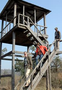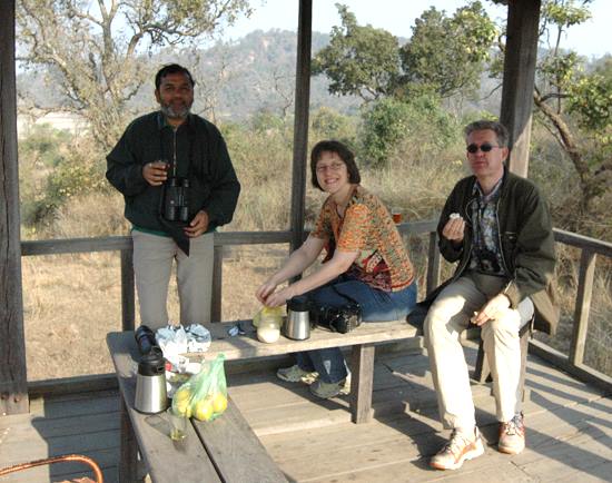 Am Morgen machten wir zwischendurch eine Rast an einem Aussichtsturm. An dieser Stelle befindet sich auch eine Rangerstation und wir kletterten auf das bedenklich wackelnde Gerüst und nahmen oben das mitgebrachte Frühstück ein. Wenn noch ein paar Tiere vorbeigekommen wären, dann hätte sich der Ausblick wenigstens gelohnt.