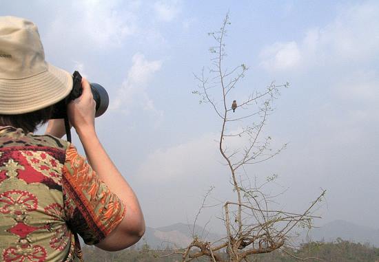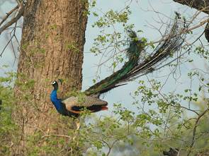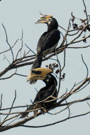 Auf beiden Rundfahrten sahen wir hauptsächlich Vögel. So wie die hübschen Racken, die wenig scheu auf Ästen in der Nähe des Fahrwegs sitzen. Wesentlich scheuer sind da schon die diversen Hühner und Wachtelvögel. Auch Pfaue haben die Ruhe weg und stolzieren gar nicht eilig zur Seite. Ein rennendes Pfauenmännchen sieht lustig aus, weil der Schwanz dann wunderbar wippt. Oft sieht man die grauen Hornvögel, doch wir hatten auch viel Glück und haben ein paar Doppelhornvögel gesehen. Da war selbst Manoj aufgeregt, denn die sieht man eher selten. Dafür sitzen sie meist auf den höchsten Ästen und sind sehr schwer zu fotografieren, in unserem Fall sogar noch gegen das Licht.