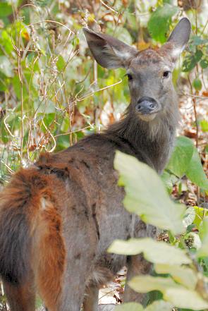 Dafür sahen wir viele andere Tiere, vor allem natürlich die diversen Rehe und Hirsche. Aber auch Schakale, Wildschweine und natürlich Vögel. Unser Begleiter Manoj, der Besitzer des Wild Brook Retreat, ist ein anerkannter Vogelexperte und sichtete viele der gefiederten Bewohner lange vor uns. Kleine Eulen im Baum hätten wir glatt übersehen. Besonders am Morgen sind im Rajaji unzählige Red Jungle Fowls (Gallus Gallus oder auf Deutsch auch Bankivahuhn) unterwegs. Alle Haushühner dieser Welt (Gallus Gallus domesticus) sind höchstwahrscheinlich durch Zucht aus dieser Art entstanden. Diese Wildhuhnart wurde schon vor über 4.000 Jahren in Indien gezähmt und gehalten, hier sieht man sie noch frei durch das Grasland und auf dem Waldboden herumlaufen.