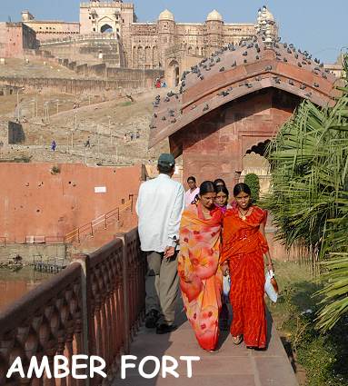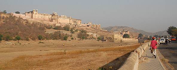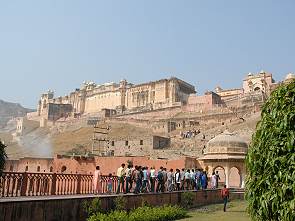 Auf dem Weg zum Fort von Amber erreicht man zuerst den Parkplatz. Hier warten alle Händler und Bettler auf Kundschaft und die Fahrer der Busse und Leihwagen auf die Rückkehr ihrer Gäste. Nur wenige Meter durch den drängelnden Verkehr über die Strasse und der Weg führt durch einen Garten zum Ticketschalter. Dann hat man zwei Möglichkeiten: man reitet auf einem Elfenten hoch oder geht zu Fuß über die gerade erneuerte Treppe. Mehr dazu auf der Seite Elefantenritt.