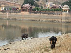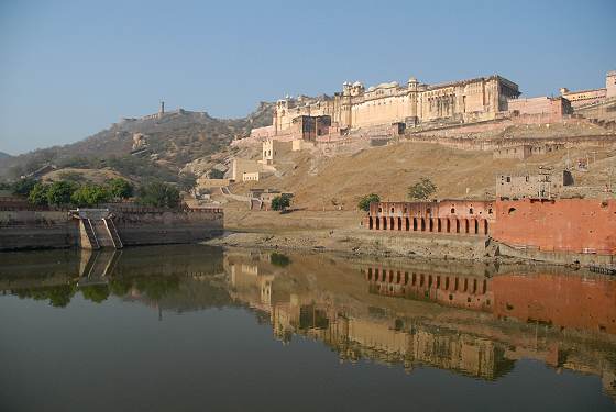Eine wichtige Sehenswürdigkeit für alle Besucher von Jaipur ist das ca. 11 km nördlich der Stadt gelegene Fort von Amber (ausgesprochen wird es Amer!). Hier befand sich sieben Jahrhunderte lang die Hauptstadt der Kachchwaha-Fürsten. Auf einem Bergrücken über dem Tal thront die ausgedehnte Palastanlage mit dem wesentlich älteren Jaigarh Fort auf dem Gipfel und spiegelt sich malerisch im Wasser des Maoto Sagar Sees zu ihren Füßen. Der Palast ist für die Öffentlichkeit zugänglich und wird von wirklich jedem Touristen besucht, der obere Teil der Festung wird militärisch genutzt und beherbergt zusatzlich ein kleines Museum mit der weltgrößten Kanone auf Rädern. Hierher verirren sich nur noch wenige Touristen, wir haben es leider zeitlich auch nicht mehr geschafft.