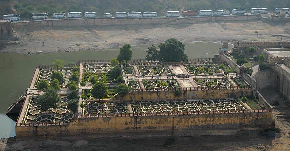 In der Mitte des Sees befindet sich ein weiterer, noch spektakulärerer Garten mit Namen Kesar Kyari Bagh, unten auf dem ersten Bild zu sehen. Vom Palast aus hat man immer wieder tolle Auslicke auf die vollkommene Harmonie. Die Gärten werden unterteilt durch Kuppeln und gitterartig durchbrochenem Filigranwerk aus Marmor. Hier sollte Safran wachsen, welches der Maharaja auf einer Reise in den Himalaya kennengelernt hatte.