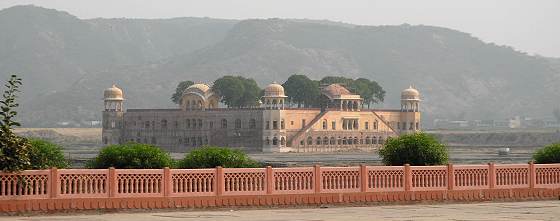 Auf dem Weg von der Innenstadt von Jaipur hinaus nach Amber kommt man an einem weiteren berühmten Gebäude vorbei: Der Jal Mahal ist ein Palast aus dem 18. Jahrhundert. Er liegt mitten im Mansagar See der vom gleichnamigen Damm gestaut wird, umrahmt von den Nahargarh Hills. Die ersten vier Stockwerke liegen unter Wasser, nur das oberste ragt noch heraus. Am Morgen wirkt er fad, aber am Nachmittag kann man am Ufer des Sees anhalten, dann wird er wunderbar von der Sonne angeleuchtet. Leider wurde gerade bei unserem Besuch etwas restauriert und die Gerüste sahen aus der Nähe wenig fotogen aus.