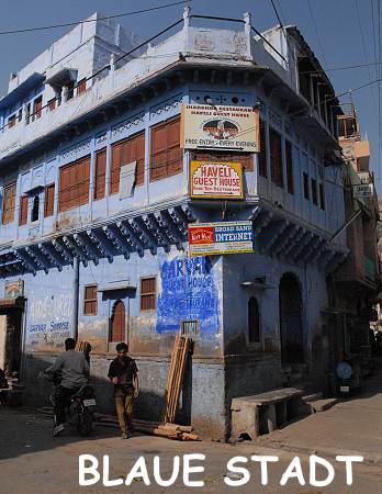 Auch wenn andere Orte in Rajasthan ebenfalls blaue Häuser aufweisen, ist die Farbe hier in Jodhpur besonders intensiv, eher ein veilchenblau. Und spricht es sich herum, das Touristen diese Bemalung besonders hübsch finden und das bringt Geld in die Kassen. Eigentlich entsteht das Blau durch Beimischung von Kupfersulfat zu weißer Kallktünche, als Schutz der Gebäude gegen Termiten. Das Ausmaß des Anstrichs erkennt man sehr schön von der alles überragenden historischen Festungsanlage Meherangarh, deren Besuch ich mehrere Seiten mit vielen Bildern gewidmet habe. Das Museum dort ist absolut sehenswert, ebenso der Ausblick über die Stadt.