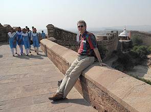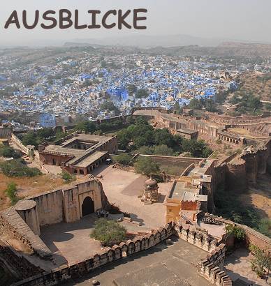 Vom der sicher mehr als 15 m breiten und mit Kanonen gespickten Mauer der Festung Meherangarh öffnet sich der Blick auf lauter Kuben: ein Häusermeer bis fast an den Horizont. Die Fassaden kennen meistens nur eine Farbe: Blau, blau und wieder blau, ein wunderschöner Anblick. Das mächtige Fort wirft einen riesigen Schatten auf die Stadt. Die Aussicht passt perfekt zu den blauen Schuluniformen der Schulklassen, die gerade im Fort zu Besuch waren und sich uns neugierig nähern. Zur Zeit waren wir die einzigen Touristen auf der Festungsmauer, es war Mittag und die Sonne brantte heiß vom Himmel. Einem forsches oder schüchternen: "Hello Sir, where you from? What´s your country" folgt nach Beantwortung der Frage unsererseits stets mit "My country India" entgegnet.