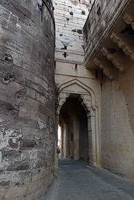 Dann geht es weiter steil bergauf und der Blick hoch entlang der steilen Mauern ist überwältigend. Das letzte Tor ist das gewaltige Sonnentor Suraj Pol, dahinter schließen sich die Palastanlagen an. Sie beherbergen heute das Mehrangarh Museum, dem ich eine eigene Seite gewidmet habe.