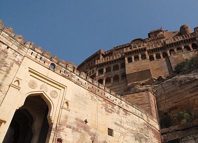 Das Fort besteht aus einer kompakten Palastanlage umschlossen von rings um den Felsen verlaufenden Bastionen und Befestigungsanlagen. Einst lebten hier Könige und ihre Frauen, die behaupteten von der Sonne abzustammen. Es waren die Rathore-Krieger, einer der führenden Rajput Clans, die Rajasthan, das Land der Könige, für mehr als 1000 Jahre beherrscht haben. Ihr Königreich, hier am Rand der großen indischen Thar Wüste hieß damals wie heute Marwar. Wörtlich bedeutet dies "Das Land des Todes". Es war im Jahr 1459, als der 15. Herrscher von Marwar, Rao Jodha, mit dem Bau von Mehrangarh begann und seinen Hauptsitz hierher in diese Stadt verlegte. Er gründete so Jodhpur, Jodhas Stadt.
