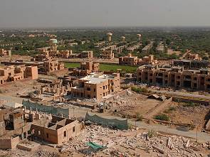 Ein Jahr später waren wir wieder in Jodhpur, diesmal mit mehr Zeit. So fuhren wir natürlich auch zum Palast, um ihn einmal aus der Nähe anzusehen. Die Fahrt führt vorbei an großen Militäranlagen und vielen Soldaten. Die Elendshütten gab es immer noch, hier leben die zahlreichen Bauarbeiter die direkt am Palast neue Häuser errichten. Wohnungen und Villen für eine gut betuchte Käuferschicht. Man parkt entlang der Zufahrtsstraße und hat beim Austeigen automatisch einen Ausblick über das riesige Neubaugebiet mit ausnehmend prächtign und aufwändigen Häsern.