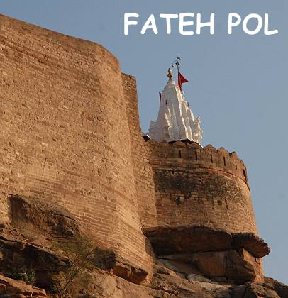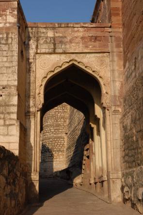 Am unteren Ende macht der Weg wieder einen scharfen Knick, davor und dahinter jeweils von einem eigenen Tor bewacht. Die beiden Mini-Kuppeln auf dem Fateh Pol markieren den alten Eingang zur ummauerten Mehrangarh Festung. Das "Tor des Sieges" wurde von Maharaja Ajit Singh im Jahr 1707 zum Gedenken an seinen Sieg über die Mughals errichtet. Hier saßen ein paar Wächter, die sich aber wenig uns kümmerten und in ein Gespräch vertieft waren. Die Informationen und die Eintrittspreise gab es hier nur in Hindi, ein Zeichen dafür dass nicht viele ausländische Besucher vorbeikommen.