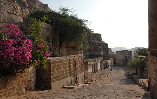 Früher war das am weitesten von Palast entfernt gelegene Fateh Pol im Südwesten der Haupteingang zum Fort für die Städter, heute waren wir auf dem Weg dorthin fast ganz alleine. Über unsern Köpfen kreiste eine enorme Anzahl an Raubvögel, wir vermuteten, dass sie neben den über uns liegenden ehemaligen Stallungen gefüttert wurden. Der Blick von hier hinauf zur Festung und entlang der steilen Fortwände ist sehr beeindruckend. Pinke Bougainvillea bildeten einen hübschen Farbfleck zu den sandsteinfarbenen Wänden, die von der Nachmittagssonne angestrahlt wurden. Ein kleiner Junge folgte uns ein Stück und schaute uns mit großen Augen an und war erst zufrieden, als wir ihn fotografiert hatten.
