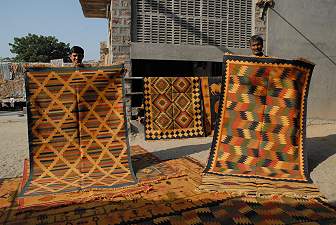 Unser Fahrer Saitan Singh schleppte uns hier zum ersten Mal überhaupt in ein Geschäft, mit der Versicherung, es wäre besonders gut und preiswert. Also taten wir ihm den Gefallen, bewunderten den Webstuhl mit einem halbfertigen Durrie und tranken heißen Chai. Dann begann die Vorführung, ein Teppich nach dem anderen wurde im Hof ausgerollt. Mal fanden wir das Muster schön, mal die Farben - aber beides zusammen nie. Der geschäftstüchtige Inhaber bot uns an, einen Teppich in Wunschfarben zu weben und nach Deutschland zu schicken. Einen Monat Zeit sollten wir ihm geben, um den Teppich zu weben. Es funktionierte hervorragend: In der Lehmhütte konnte man in einer Ecke die ausgehandelten 80 Euro plus Versandkosten mit der Kreditkarte bezahlen, die gewünschten Farben und Adresse wurden notiert und gut 6-7 Wochen später kam der gewünschte Teppich dann bei uns in Köln an.