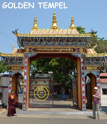 Der goldene Tempel in Bylakuppe (in Kannada auch Bailakuppe) liegt 6 Kilometer außerhalb von Kushalnagar, auf dem Weg von Madikeri nach Mysore. Bis dahin sind es von hier aus noch 42 Kilometer. Es handelt sich hier um die zweitgrößte tibetische Siedlung außerhalb von Tibet und ein Besuch der prächtigen Anlage lohnt sich auf jeden Fall.