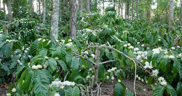 Angebaut wird sowohl der hochgewachsene Kaffee der Sorte Robusta, im südlichen Coorg mehr der flachere Arabica. Sehr schön ist eine Fahrt durch Coorg während der Kaffeeblüte, wenn weite Strecken entlang die grünen Büsche im Wald einen blütenweißen Teppich bilden. Bei unserem Besuch im März stand der Kaffee gerade in voller Blüte und duftete sehr intensiv süsslich.