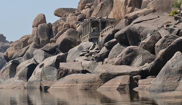 Auch unten am Ufer zwischen den Felsen auf der Bazaar-Seite lag malerisch ein kleiner Tempel. Direkt gegenüber stand eine hübsche, kleine Nandi-Statue in der Felswand. In der Flussbiegung liegt die Prozessionsstrasse von Hampi Bazaar mit vielen Besuchern, bei uns auf dem Fluss war es still. Nach einer guten halben Stunde sind wir dann zurück zum Ausgangspunkt gepaddelt, doch vorab wurden wir noch mit einigen schnellen Drehungen bespaßt, siehe Video unten.