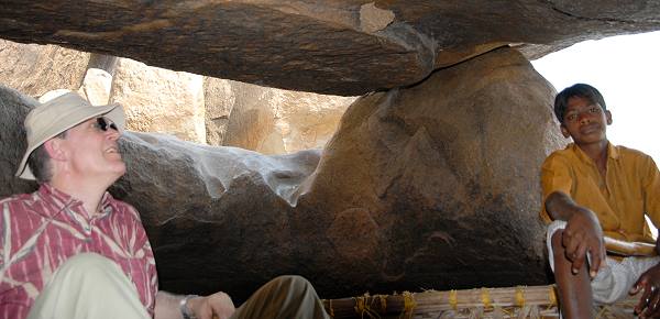 Unser kleiner Führer kannte eine schöne Stelle am Ufer, an der die Felsen eine Höhle bildeten. Dort war es wunderbar kühl und schattig, ein Vogel hatte ein Nest an der Decke gebaut. Leider war es verlassen, aber wir kamen schon mit dem Kopf an die Decke und in gebückter Haltung hielt man es dort nicht lange aus. Nach ein paar Fotos fuhren wir noch ein kleines Stück in Richtung Hampi Bazaar.
