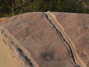 Trotzdem war der Ausblick auf die vom späten Abendlicht angestrahlte Felslandschaft atemberaubend. Die Felsen liegen wie verformte Murmeln herum, einige waren zum Teil gespalten. An vielen Stellen konnte man noch Spuren der Bearbeitung erkennen und Reihen von Bohrlöchern, wo die Blöcke dann mit quellenden Holzpflöcken aufgesprengt wurden.