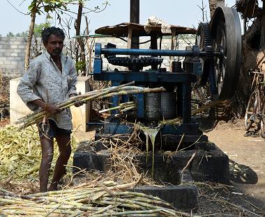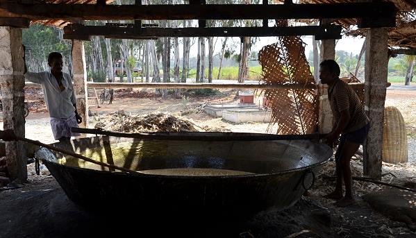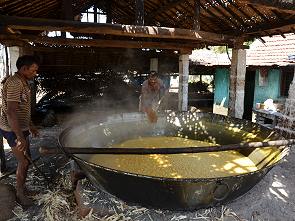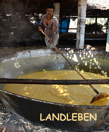 Die hier in diesem Betrieb entstandenen kanpp Kinderfaustgroßen Würfel werden nach Abkühlung verkauft. Wenn wir es richtig verstanden haben, dann stellten die Männer hier gerade in diesen modernen Formen eine beliebte Süßigkeit her. Eine Art Jaggery-Toffees, von denen wir ein kleines Stück probieren durften. Manchmal wird daraus auch der beliebte indische Whiskey gebrannt, der bekannteste nennt sich "Old Monk".