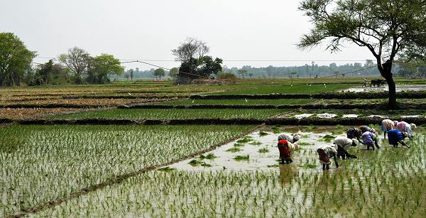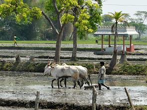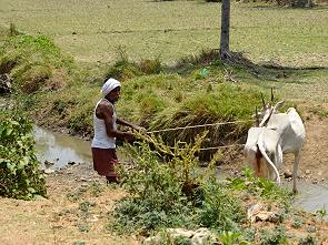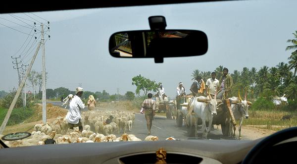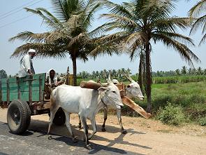 Das Wasser spielt eine wichtige Rolle für den Bewässerungsfeldbau sowie für die Energieerzeugung, die Region hier rund um Mysore ist sehr fruchtbar und viele Bauern begegnen einem auf den Straßen. Ab und zu braucht man ein wenig Geduld, um an den Straßensperren indischer Art vorbei zu kommen. So wie auf dem Foto unten, aufgenommen aus unserem Auto, wo eine Schafherde die Weiterfahrt blockierte. Das satte Grün der Felder, die Ochsengespanne und die Bauern bilden eine typisch indische Kulisse.