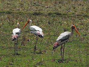 An einer Stelle hatten wir Glück und auf einem Feld am Straßenrand konnten wir eine Gruppe Buntstörche (Mycteria leucocephala) beobachten. Es handelt sich dabei um eine im tropischen Asien lebende Nimmersatt-Art. Diese imposanten Vögel werden 95 - 100 cm lang und waren auf den feuchten Feldern auf Nahrungssuche. Als wir anhielten und näher kamen, ließen sie sich nicht erschrecken und gingen nur gemächlich hinter eine Hecke, so als wüssten sie, dass man sie dann nicht mehr fotografieren kann. Ein zufällig vorbeikommender Bauer war mehr an uns interessiert, wahrscheinlich verstand er gar nicht, was uns an diesen Tieren so begeisterte.