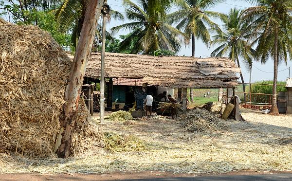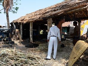 Vor der Hütte wurde Zuckerrohr mit einer einfachen Mangel gepresst. Als Nebenprodukt bleibt der faserige Anteil zurück, die Bagasse. Sie wird weiterverwertet als billiger Brennstoff innerhalb der Zuckerproduktion oder als Viehfutter.
