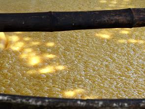 Der so entstandene Saft, die Melasse, fließt über Steinrinnen in einen Bottich. Dort wird er von Schlamm und anderen Verunreinigungen gefiltert.