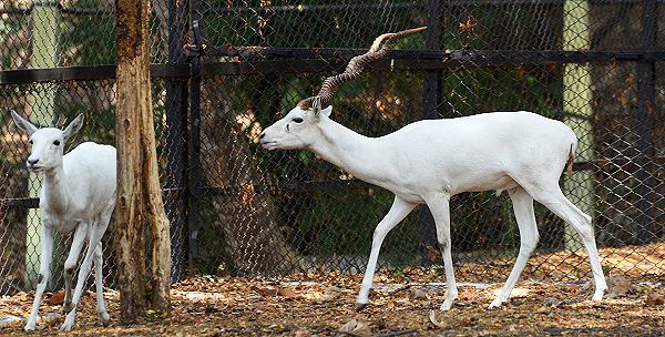 Sehr ungewöhnlich waren auch die beiden Albino-Hirschziegenantilopen. In Rajasthan hatten wir die schlanken Antilopen schon in der Wüste gesehen, aber in weiß wirkten sie wie Fabeltiere.
