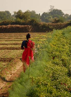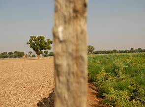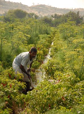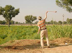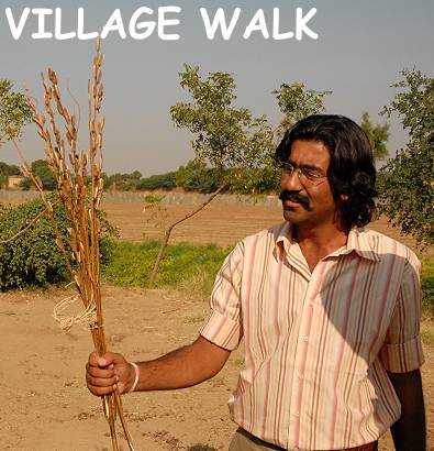 Mit Nandi, einem der beiden Besitzer der Unterkunft und auch des umliegenden Landes, machten wir nach dem Frühstück eine so genannte Village Tour mit dem Jeep. An diesem Tag hatten wir unseren kundigen Führer ganz für uns alleine und konnten viele Fragen stellen. Zuerst fuhren wir über Feldwege, auf denen wir noch am Morgen auf der Jagd nach schönen Vogelbildern unterwegs waren. Die Fahrt ging zu einem typischen bewässerten Feld, auf dem allerlei Gemüse und anderes nebeneinander angebaut wird. Hauptsächlich wuchsen hier Chillies und Anis, die sich je nach Wachstumsphase gegenseitig Schatten geben, dazu an den Rändern der Haupt-Wasserkanäle noch eine ganze Mange anderer nützlicher Pflanzen, die mehr Wasser brauchen: Baumwolle, Auberginen, Kohl, Sesam oder Henna für den lokalen Bedarf. Alles wird verwendet, selbst Abfallprodukte werden getrocknet und zum Kochen oder für ein wärmendes Feuer verbrannt. Hier wird nichts verschwendet und aus Plastik waren nur die Bänder aus alten Musikcassetten, die flatternd und reflektierend die Vögel vom Feld fernhalten sollten. Ein Wächter, angestellt, un die räuberischen Piepmätze zu vertreiben, zeigte uns, wie er dies durch lautes Rufen und mit Hilfe von Lehmklumpen und einer langen Schleuder den ganzen Tag lang tut. Michael konnte die Schleuder auch ein paar Mal ausprobieren, aber es bedarf doch einiger Übung, die Lehmbrocken gezielt quer über das ganze Feld zu schleudern.
