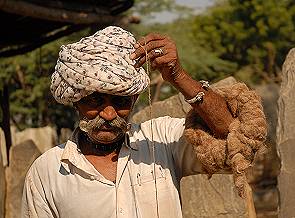 Direkt vor der Schule ist der Dorfbrunnen, hier treffen sich alle zum Gespräch. Nandi meinte scherzhaft, dort würde die wahre Politik gemacht, weil am Brunnen von den Frauen besprochen wird, was ihre Männer im Dorfrat beschließen sollen. Der Weg durch das Dorf führte vorbei an einigen Hirten, die gemütlich beisammen sassen. Einen Hof weiter saß ein Hirte im Ruhesand. Er zeigte uns, wie er Kamelhaar spinnt, um Teppiche daraus zu weben und wie er flink aus 9 Metern Tuch seinen Turban wickelt. Wir konnten uns auch die klassische Dachziegelkonstruktion seines Hauses aus der Nähe ansehen. An der weißen Farbe seines Turbans war erkennbar, das er ein Hirte im Ruhestand ist.