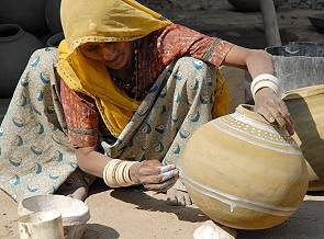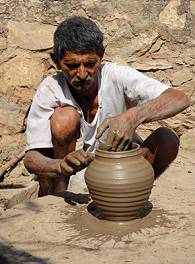 Weiter ging es zum lokalen Töpfer, den wir bei seiner Arbeit im Hof beobachten konnten. Dort entstand aus einem Klumpen Lehm auf einer schweren einfachen Drehscheibe ein Gefäß, in dem im Dorf das Wasser aufbewahrt wird. Gleichzeitig sind die runden Töpfe Klimageräte, denn durch den porös angemischten Ton tritt etwas Wasser aus und verdunstet. So werden Inhalt und Raum kühl gehalten. Die Behälter werden zweimal jährlich in einer großen Erdkuhle unter einem Reisigfeuer gebrannt, 1500 Stück auf einmal, das Feuer brennt die ganze Nacht. Zu Holi und Dewali, also zum Anfang von Sommer und Winter, werden sie in den Haushalten ausgetauscht, da die Klimatsierungsfunktion durch chemische Reaktionen im Ton nur ca. 6 Monate lang funktioniert.