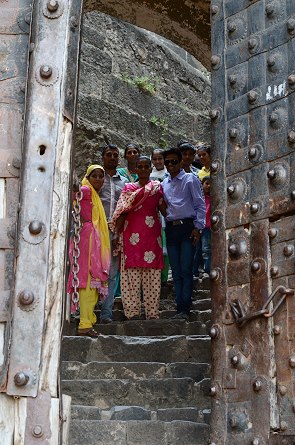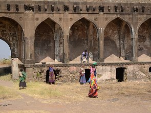 Unterwegs war keine Menschenseele zu sehen und wir dachten, wahrscheinlich sind wir ganz alleine hier oben. Aber als wir fast oben in Kamargarh angekommen waren machten gerade grössere Gruppen von Arbeitern am Rand des Weges Mittagspause im Schatten. Frauen und Männer in der typischen Tracht der Region waren damit beschäftigt, die Zufahrt etwas zu verbreitern, Ausweichstellen anzulegen und die dicksten Steine beiseite zu schaffen. Hier wurde eindeutig in das historische Erbe investiert, das schafft auch Arbeitsplätze für dioe lokale Bevölkerung. Wir wurden natürlich bestaunt wie bunte Hunde, schließlich waren wir die einzigen Europäer weit und breit. Oben angekommen zischte es und unser armer Fahrer musste einen Reifen wechseln. Er fand aber genug Helfer uns wir machten uns auf den Weg die nächsten Treppen hinauf durch die Tore ins Fort Asirgarh. Eintritt zahlt man hier (noch) nicht, aber in einem alten Wachgebäude neben dem Eingang saß jemand, der die Herkunft der Besucher erfasste. Auch ein paar indische Touristen hatten den Weg nach oben gefunden, aber die meisten Menschen im Inneren des Fort waren Arbeiterinnen.