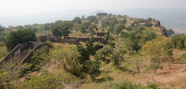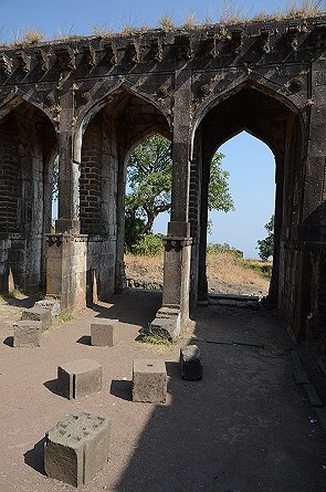 Innerhalb des Forts befinden sich die für den entlegenen Standort relativ große und prächtige Asir Masjid Moschee mit zwei Minraretten und ein Shiva-Tempel, der Gupteshwar Mahadev Tempel, das sind auch die am besten erhaltenen Gebäude. Es gibt noch drei tiefe Zisternen, aber wir waren in der Trockenzeit hier und Gras und Büsche waren ziemlich Braun. Bilder aus der Regenzeit, die man im Internet findet, zeigen üppig grünen Grasbewuchs, selbst auf den Mauern. Sonst gibt es hier nur Ruinen, in einem Kellergewölbe hörten wir aus der Tiefe das Fiepen zahlreicher Fledermäuse. Bei Ausgrabungen wurden Funde hier aus vorchristlicher Zeit gemacht.