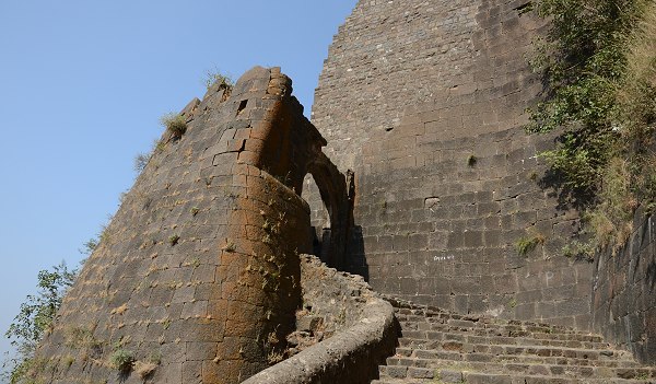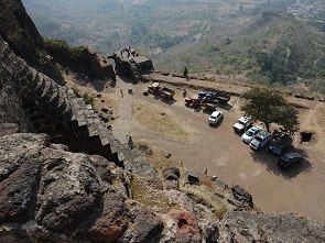 Unser Fahrer war noch nie hier und fragte unten im Dorf Ghaser die Einheimischen, die ihm den richtigen Weg zeigten. Eine schmale Straße führt von Westen aus hinauf zum Fort, beginnend an einem modernen Gebäude, das wohl mal so etwas wie ein Besucherzentrum werden soll. Sie wurde einst von den Briten erbaut schlängelt sich 7 Kilometer lang entlang des Berghangs nach oben und wird immer holperiger, je höher man hinauf fährt. Der Blick auf die Mauern des Fort von unten ist sehr beeindruckend, unser Fahrer brauchte aber die volle Konzentration für den Weg. Mit einer sehr scharfen Kuve geht es weiter bergauf, einmal am Fort entlang und der Weg endet auf einem Vorplatz unterhalb der Eingangstore. Hier endet auch ein zweiter Zugang von Westen, also vom Highway aus, der von der Vorfestung Malaygarh unten am Berg über steile Treppen nach hier oben führt.