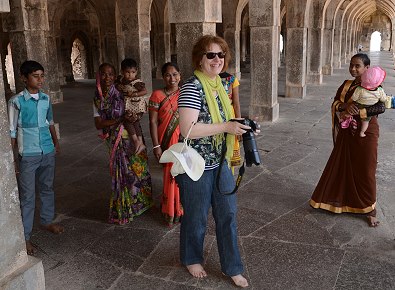 Hier gab es schattige Plätze unter großen, prunkvollen Bögen und zwischen Säulen. Von den Fenstern aus hat man eine schöne Aussicht auf die Umgebung, leider war die Sicht nicht sehr klar. Hier machten wir eine kurze Rast. Leider hatten alle indischen Besucher ihr Handy dabei und machten natürlich mit uns ein paar Fotos. Ich revanchierte mich mit Gegenfotos, so wie immer. An einem kleinen Kiosk konnten wir sogar Tüten mit Chips kaufen, die salzigen Kartoffeln taten gut in der Hitze. Auch hier machten die Arbeiterinnen gerade Mittagspause und packten ihr Essen aus.