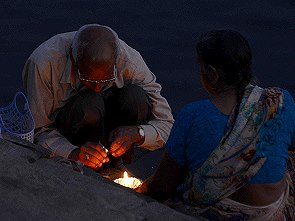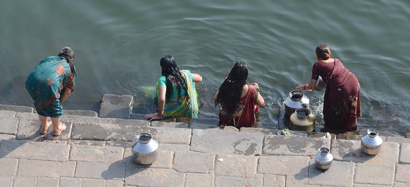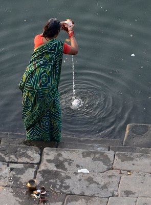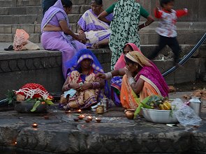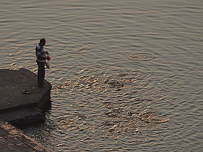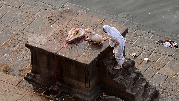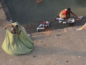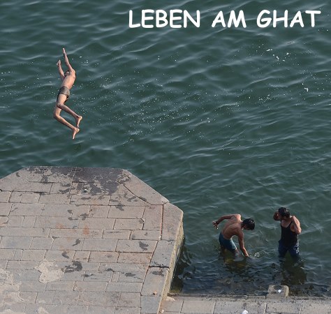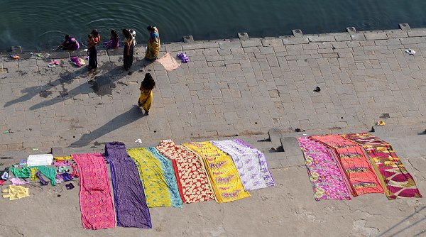 Die Frauen baden hier auch, mit Vorliebe früh am Morgen und nach der Wäsche werden die bunten Stoffbahnen der Saris auf den Steinen zum Trocknen ausgelegt. Kühe und Ziegen haben an den Ghats ebenfalls das Recht auf frei Wahl des Weges, dazwischen Mopedfahrer und Händler mit Handkarren. Ein buntes Bild, dem man von oben oder auch unten auf den Treppen sitzend zu jeder Tageszeit stundenlang zuschauen kann.