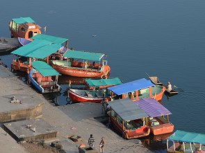 An den Ghats von Maheshwar kann man wunderbar flanieren, zahlreiche Boote liegen hier am Ufer und warten auf Kundschaft. Sie dienen als Fährboote zu den Dörfern am anderen Ufer oder als Ausflugsboote für die meist indischen Touristen. Einige davon sehen aus wie umgebaute alte Hochsee-Rettungsboote, bei manchen ist das ursprüngliche Dach entfernt, andere haben noch ein richtiges Schott in der Wand am Ende des Bootes, auf einem stand "Monrovia" als Heimathafen des Schiffes, welches vermutlich am Strand in Alang abgewrackt wurde - das liegt fast gegenüber der Mündung der Namara in Gujarat nur 400 km entfernt.
