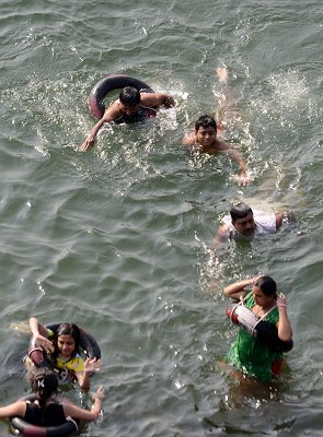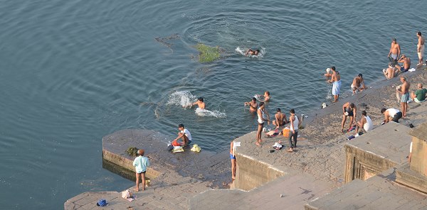 Kleine Tempel und Nandi-Statuen werden liebevoll von älteren Frauen mit Blüten geschmückt. Die Männer treffen sich zum Baden, springen mit Kopfsprung und Anlauf ins klare Wasser und machen Wettschwimmen zur ganz schön weit entfernten Boje in der Flussmitte. Ausgelassen wie die Kinder, es dringt viel Gelächter hinauf zum Fort. Vom Ufer aus werden gerne Fische gefüttert, dann brodelt das Wasser, wenn Futter hinein geworfen wird. Überall stehen blaue, zeltähnliche Häuschen aus Metall, in denen man sich sicher vor fremden Blicken umziehen kann.