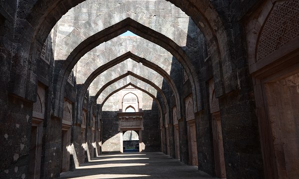 Nicht weit von dem fantastischem Bauwerk des Schiffspalastes liegt der Hindola Mahal, auch Schwingender Palast genannt. Seinen Namen hat er durch seine besondere Konstruktion erhalten. Die Grundform ist T-förmig und das Dach der langen Halle hat fünf massive Kielbögen, die etwas gotisch wirken, also in der Mitte spitz zulaufen. Hierbei handelte es sich um eine Audienzhalle, oder Durbar Hall, die ebenfalls auf die Herrschaft von Ghiyas-ud-din zurückgeht. Sie ist 30m x 18m x 12 Meter gross, die Mauern sind 3 Meter dick und weiter durch massive Schrägstrebepfeiler verstärkt. Zum Abfangen der nach außen wirkenden Kräfte sind die Längsmauern dieses Palastes an der Aussenseite nicht senkrecht, sondern nach unten hin breiter werdend angelegt, dass der Winkel mehr als 77 Grad beträgt.