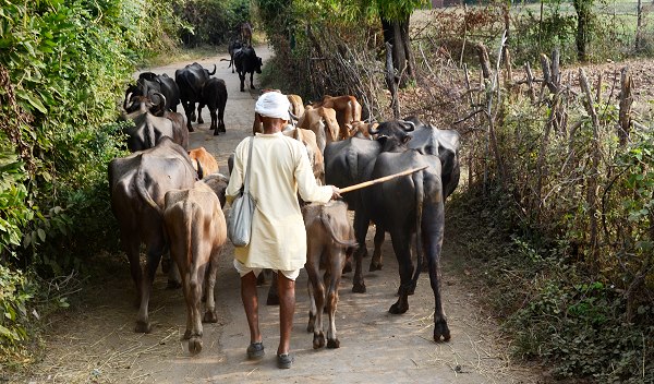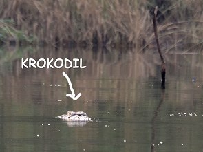 Nachdem wir noch ein paar Eisvögel beobachtet hatten, ging es dann zurück in Richtung Bootssteg. Unsere Führer wollten uns unbedingt noch ein Krokodil zeigen und tatsächlich: in einer Bucht konnte man mit viel Mühe und Blick ins Gegenlicht ein paar Augen im Wasser erkennen. Da waren beide glücklich, denn viel mehr als ein paar Vögel gab es hier leider nicht zu sehen, kein Hirsch kam aus dem Wald um am Ufer zu trinken. Nach knapp 2 Stunden waren wir dann wieder zurück an der Anlegestelle und fuhren mit dem Jeep zum Hotel, vorbei am Dorf, in dem gerade die Kühe auf die Weide getrieben wurden. Nach unserer Rückkehr wartete ein leckeres Frühstück auf der Terrasse mit Blick auf das Wasser auf uns.