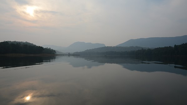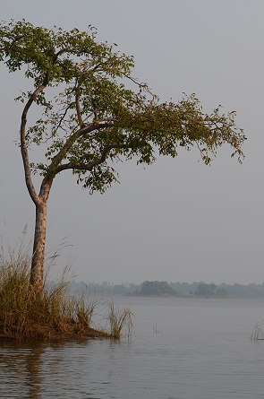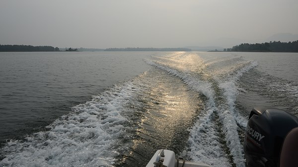 Zusammen mit dem Naturalisten vom Hotel stiegen wir dann in ein kleines Boot, in dem schon ein offizieller Nature Guide und der Bootsführer sassen. Schwimmwesten mussten wir anziehen, dann ging es los. Jetzt im November war das Reservoir voll bis zum Rand nach gutem Monsun Regen. Daher lagen die kleinen Inseln in der Mitte alle unter Wasser und Blasen von Methangas der faulenden Vegetation stiegen vom Grund hoch. Das Wasser lag am Morgen ruhig ohne Wellen, weil es windstill war, und der Fahrtwind war noch recht frisch. Gut, dass wir unsere warmen Jacken anhatten. Die Morgenstimmung mit Nebel und aufgehender Sonne war wunderschön und wir fuhren am Ufer des Nationalparks entlang, immer auf der Suche nach Tieren. Ein paar bewachsene grössere Inseln gab es in Ufernähe.