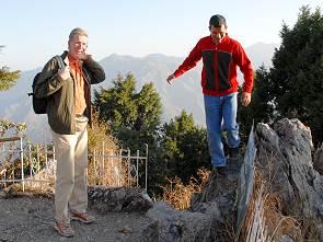 Auf 2.142 Metern Höhe erhebt sich der Gun Hill hoch über dem Ort Mussoorie und ist damit die zweithöchste Erhebung. Von dort oben hat man einen herrlichen Blick auf die schneebedeckten Himalajaberge wie Bunderpunch, Srikantha, Pithwara und Gangotri. Wenn man nicht, wie wir Pech mit dem Wetter hat und vor lauter Dunst gar nichts sieht oder die Schneekuppen nur erahnen kann. Während unseres Aufenthaltes hatte man die Seilbahn, die hoch zum Gun Hill führt, gerade für ein paar Tage wegen Wartungsarbeiten stillgelegt. Sie ist nur 400 Meter lang und eine Fahrt kostet 50 Rupien hin und zurück. So konnten wir den Gipfel nur zu Fuss erreichen, was wir sehr früh am Morgen in Begleitung von unserem Guide Manjeet auch taten. Noch vor dem Frühstück machten wir uns auf den Weg hinauf zum Gipfel, eine asphaltierte Straße mit enormer Steigung führt in Serpentinen bis auf halbe Höhe, dann gibt es hoch bis zur Endstation der Seilbahn nur noch zementierte Fußwege zwischen den Häusern. Manjeet, an das Trekking im Himalaya gewohnt, bewältigte den steilen Aufstieg recht locker, wir kamen dabei ziemlich ins Schwitzen und Keuchen.