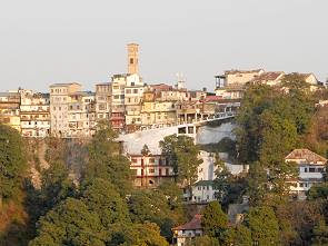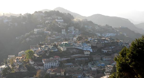 Mussoorie liegt nahe Dehradun, der Hauptstadt von Uttarakhand, im Dehradun-District. Hoch in den steilen Ausläufern der Berge des Himalaja gelegen, ist die beliebte Hillstation auch unter dem Beinamen "Queen of the Hills" bekannt. Neben dem Hauptort gehören auch noch ein großes Militärquartier und die beiden Orte Barlowganj und Jharipani dazu. Alle Gebäude liegen über 15 Kilometer verstreut auf sehr steilen Bergrücken in gut 2.000 Metern Höhe. Schon die Anfahrt von Dehradun ist beeindruckend, denn man kann den Ort auf dem Bergrücken schon von der Ebene aus sehen. Für die wenigen Kilometer braucht man allerdings fast zwei Stunden, denn die Straße schlängelt sich in scheinbar endlosen Serpentinen die Berge hinauf, mit einigen Imbissständen am Wegrand und immer wieder schönen Ausblicken auf das Doon Valley und die Hauptstadt. Leider war es bei unserer Auffahrt recht diesig, ein Weitblick blieb uns versagt. Ist man oben angekommen, hat man normalerweise auch einen ersten Blick auf die schneebedeckten Himalayaberge. Leider war die Luft die ganzen drei Tage während unseres Aufenthaltes sehr dunstig und nur einmal, ganz früh am Morgen, konnten wir die Schneeriesen am Horizont erahnen. Bei klarem Wetter, normalerweise sollte das auch im März sein, ist die Aussicht bestimmt wunderbar.