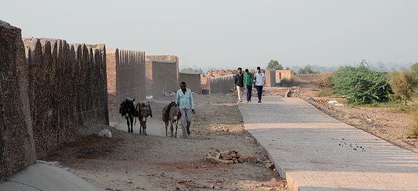 Die Anlage ist ein etwas krummes Quadrat von über 250 Meter Seitenlänge mit zwölf hervorstehenden halbkreisförmigen Bastionen auf jeder Seite, dazu gibt es noch vier Ecktürme. Diese Bauweise ist ein Grundmerkmal der Mogul Festungs-Achitektur. Die Mauern sind geschätzt je nach Himmelsrichtung und Lage zum ausgetrockneten Flussbett etwa 15-20 Meter hoch. An einigen Stellen gibt es zwischen zwei Bastionen keine Mauer, sie ist eingefallen und die Ziegel sind bergab gerutscht. Dort schmiegen dich die Häuser der Einheimischen direkt an den Hügel, sie wurden sicherlich teilweise mit den alten Ziegeln erbaut.