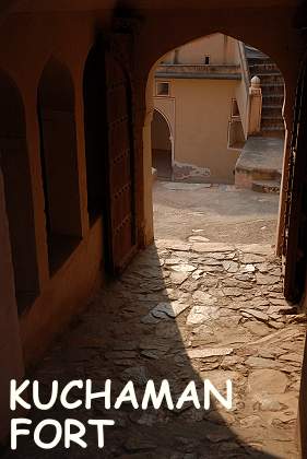 Schon die Anfahrt zum Hotel ist ein Erlebnis. Nachdem man durch die engen Gassen der Stadt Kuchaman zentimetergenau an Geschäften und Handwerkern vorbeigefahren ist, erreicht man einen Innenhof am Fuße des Berges, auf dem das Fort thront. Hier befinden sich einige schmucklose Nebengebäude, in denen die Fahrer der Gäste und das Personal untergebracht sind.