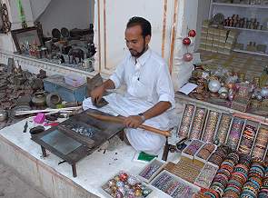 Besonders interessant fand ich den Handwerker, der geschickt aus einem Kunststoff ähnlich wie Siegelwachs bunte Armreifen herstellt. Sein kleiner Sohn ist ein guter Werber und wir blieben stehen, um ihm beim Entstehen eines Reifens zuzuschauen. Das Wachs wird über einem winzigen Holzkohlefeuer erhitzt, dann zu einer Wurst gerollt. Bunte Plastikfäden und Goldglimmer werden aufgetragen und mit eingeschmolzen, dann ein Ring geformt und mit schnellen Schlägen eines Holzstabes in eine halbrunde Form gepresst. Nach dem Erkalten hat man dann einen schönen Armreif mit gleichmäßigem Muster. Natürlich haben wir dem Meister auch 2 Stück abgekauft, darüber war ich später sehr froh, denn so gefertigte Armreifen habe ich an keinem Ort wieder gefunden.