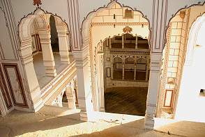 Ebenfalls tief im Bauch der Festung, über rutschige Rampen zu erreichen, liegt der Jal Mahal, der Swimming Pool. Dass unterirdisches Bad mit hohen Bögen und Deckenmalereien ausgestattet wurde vor 250 Jahren erbaut. Heute können im kalten Wasser die Hotelgäste schwimmen gehen und auf dem Rücken treibend die erotischen Malereien an der Decke betrachten, wo einige Frauen gerade mit dem Gott Krishna spielen. Eine Empore führt einmal um den Pool herum.