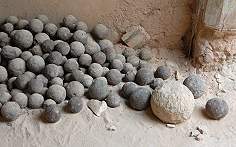 Bei einem Rundgang ist der weiße Lok-Devatas Tempel immer ein guter Richtungsweiser, wenn man sich mal im Labyrinth der Gänge verlaufen hat. Er wurde von Raja Ranjit Singh erbaut aus Dankbarkeit gegenüber seinem Volk, das angeblich freiwillig als Heer feindliche Invasoren vertrieb und so den Fortstand seiner Dynastie ermöglichte. In einigen Ecken liegen noch verstaubte Kanonenkugeln herum, rechts auf dem kleinen Bild sind sie zu sehen. Wir mussten beim Rundgang immer auf Kopf und Füße achten, da Türen hier meist sehr niedrig und Türschwellen sehr hoch sind. Ganz oben hoch befindet sich der älteste Teil des Fort mit mächtigen Befestigungswällen, Zisternen und Schießscharten, mittendrin der Notstromdiesel des Hotels.