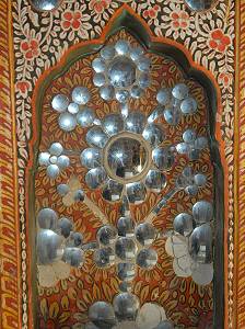 Hier hatten sich die Farben im Inneren sehr gut erhalten und die wunderbaren Malereien waren noch zusätzlich kunstvoll mit Spiegeln und Blattgold dekoriert. Es handelt sich hier eindeutig um alte Originale und nicht um restaurierte Bilder, denn an einigen Stellen gab es durchaus Macken und fehlende Stücke. Besonders die üppig verzierte Decke beeindruckte, hier waren deutlich talentiertere Künstler am Werk als an den Außenfassaden. Eine Prozession aus Elefanten, Tänzerinnen, Tänzern, Kühen und Blumenranken zieht sehr farbenfroh am Auge des Betrachters vorbei. Natürlich bekam der ängstliche Wächter sein Trinkgeld, er war aber froh, als wir dann endlich wieder weg waren.