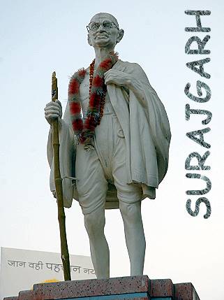Am späten Abend gingen wir mit unserem Kellner noch zu einem örtlichen Händler mit einem Laden am Marktplatz um Safran und getrocknete Wüstenbohnen (Kher Sangri) zu kaufen und alle Leute grüßten freundlich. Surajgarh ist bekannt für die Produktion von Lack-Armreifen, die hier in allen Farben produziert und mit Glitzersteinen verziert in den kleinen Läden verkauft werden. Am Marktplatz steht eine Statue von Mahatma Ghandi, der hier auf seiner Wanderung von Gujarat nach Delhi durchgekommen war.