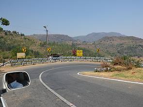 Höhepunkt der Strecke sind die 36 Serpentinen oder Hair Pin Bends, die hier in die Berge gebaut wurden. Sie sind durchnummeriert und in jeder Haarnadelkurve steht ein Spiegel, mit dem man den entgegen kommenden Verkehr kontrollieren kann. An einigen wenigen Stellen konnten wir kurz halten, trotz schöner Aussicht gab es leider keinen allgemeinen Ausblick auf den spektakulären Verlauf der Strecke